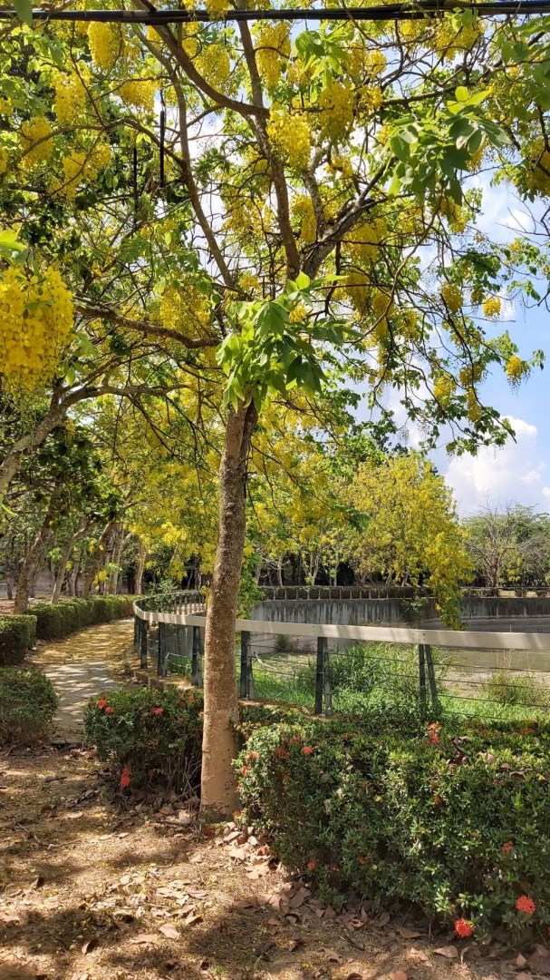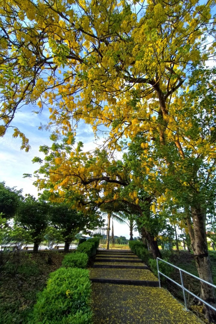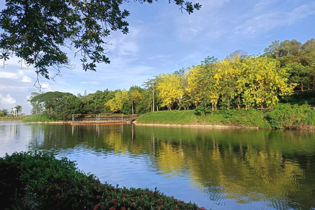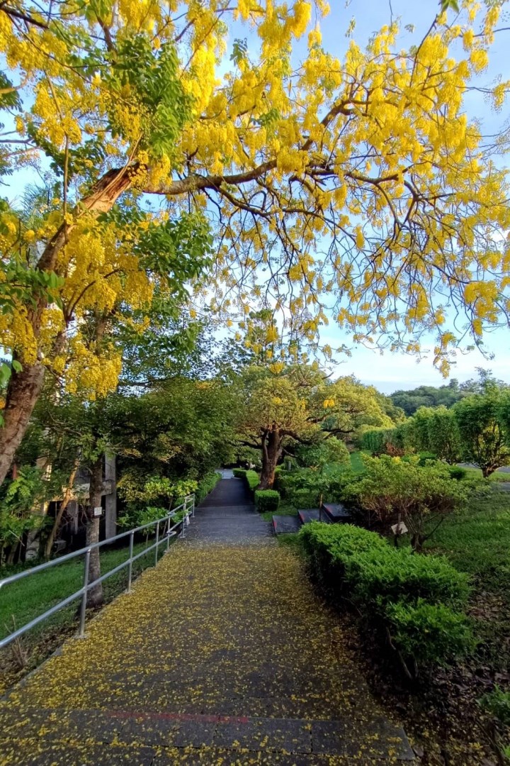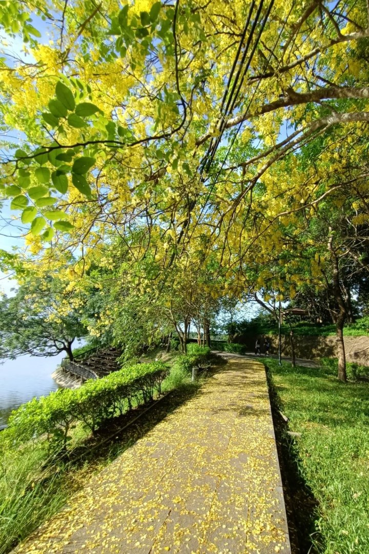 六月是阿勃勒盛開的季節,台南地區多處街道及風景區一片耀眼金黃,阿勃勒花分佈在台南地區各個角落,泰半多已近尾聲,不過,位於新化虎頭埤風景區的阿勃勒因依畔湖邊,花開較慢,值此六月梅雨期正值花瓣掉落,園區飄下黃金雨最佳賞花、賞景時期。