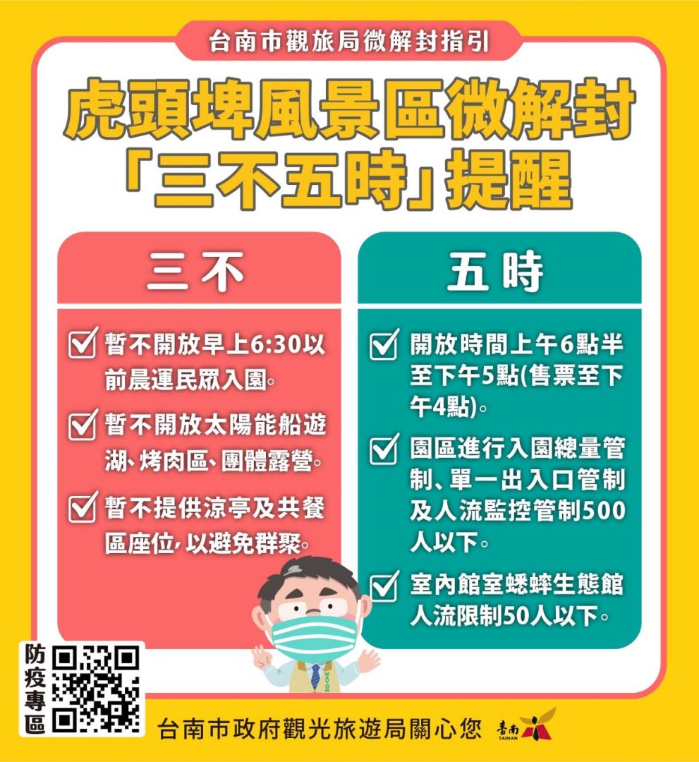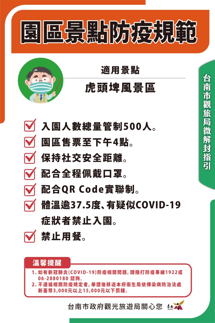 虎頭埤風景區管理所表示,因應三級警戒微解封開園,除了一般性防疫規定如QR-code實聯制、全程配戴口罩、保持社交安全距離、量額溫、人流管控、加強清消外,仍需有如下管制措施:園區進行入園總量管制、單一出入口管制及人流監控管制500人以下,開放時段AM6:30~PM5:00,售票至PM4:00(暫不開放早上6:30以前晨運民眾入園),封閉涼亭及共餐區座位,避免群聚,室內館室蟋蟀生態館人流限制50人以下,露營區僅接受家庭及個人露營(一帳4人以內,採預約制06-5901325);暫不開放團體露營,太陽能船遊湖、烤肉區暫不提供服務,假日導覽解說服務暫停提供。同時,園區也將增加園區巡視人員及增加巡視頻率,加強防疫宣導作業,如有遊客不遵循相關防疫規定者,經舉證後將移送本府衛生局依傳染病防治法處新臺幣3,000元以上15,000元以下罰鍰。園區歡迎遊客微解封後的到來,不過,為了自己,也為了他人,大家共同做好健全的防疫工作,認真防疫也能安心旅遊。