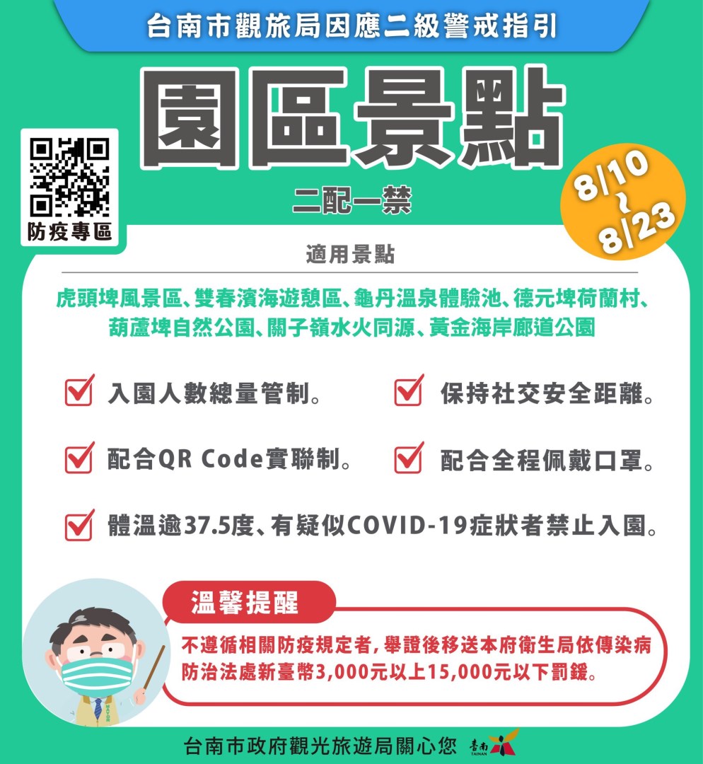 本市二級警戒(8/10後)部份景區放寬人流管制上限: