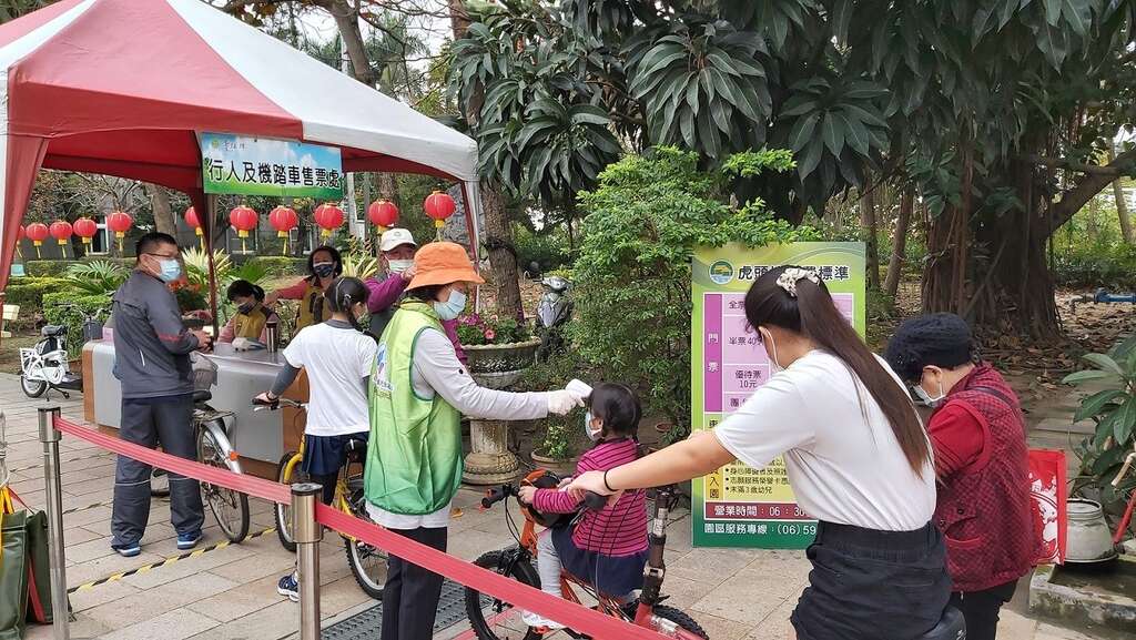 虎頭埤風管所有關春節期間轄管園區推行加強及落實防疫措施如下:1.開放早上5:30~6:30晨運民眾入園。(售票時段6:30~17:00,開放至18:00)。2.園區採單一入口管制,並進行入園總量管制,人流監控逾4,000人即管制一出一進3.加強園區環境清消工作,員工列冊落實健康管理。4.提供酒精及肥皂或洗手乳供遊客使用。5.入園量測體溫,逾37.5度即禁止入園,有發燒或疑似COVID-19症狀者不得入場。6.入園遊客未能保持安全社交距離時應佩戴口罩、配合實聯制。7.露營區、烤肉區採家庭預約制。8.開放蟋蟀生態館、太陽能船遊湖。