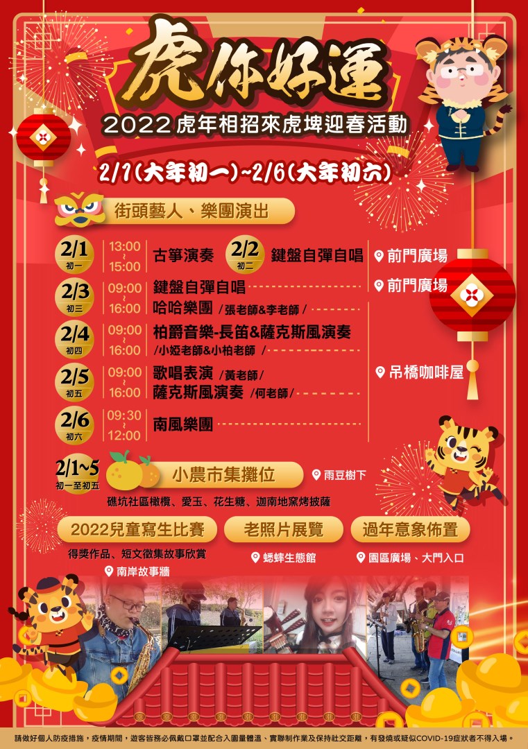 觀光旅遊局局長郭貞慧表示,本局所轄虎頭埤風景區考量防疫安全,今年新春活動仍採取較不群聚性的街頭藝人、小樂團等音樂演出、在地特色的小農市集及較靜態的2022元旦兒童寫生得獎作品、短文徵集故事及老照片欣賞等,希望在防疫規範下能陪遊客安心過新年。