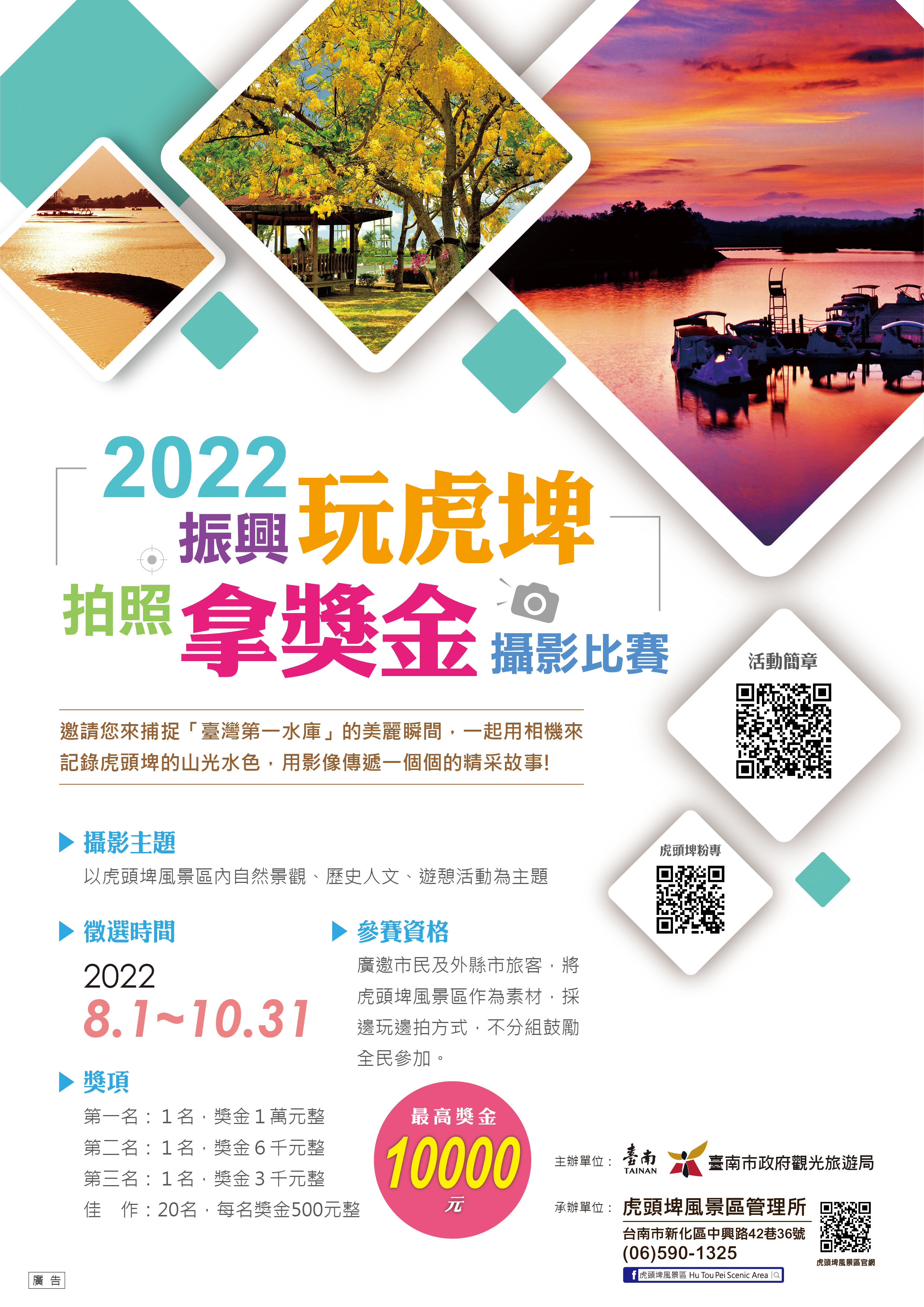 適逢暑假出遊旺季,臺南市政府觀光旅遊局特別辦理2022「振興玩虎埤 拍照拿獎金」攝影比賽,邀請您來捕捉「臺灣第一水庫」的美麗瞬間,以虎頭埤風景區內自然景觀、歷史人文、遊憩活動為主題,一起用相機來記錄虎頭埤的山光水色,用影像傳遞一個個的精采故事!廣邀市民及外縣市旅客多多外出,並停下腳步欣賞,將虎頭埤風景區人事物作為素材,採邊玩邊拍方式,不分組邀請全民參加。只要於111年8月1日至10月31日止徵稿(郵戳為憑)繳交作品就能參加比賽,用手機隨手拍,用鏡頭玩創意拿獎金,預計將徵選出23張精選作品,最高獎金1萬元,活動簡章請詳見虎頭埤風景區官網https://htp.tainan.gov.tw/。