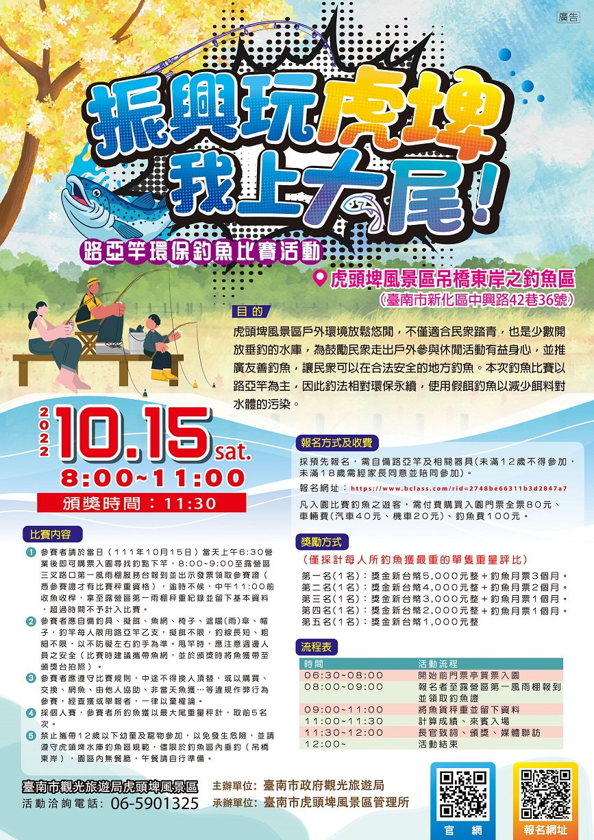 觀光旅遊局局長郭貞慧指出,今(111)年三月觀旅局虎頭埤風景區有舉辦過釣魚比賽,當時以外來魚種為目標,共移除了93公斤 魚種,吸引了逾3,600人次入園,媒體爭相採訪造成不小的轟動,此次釣魚比賽稍微修改了內容,比賽以最大尾魚種為目標,虎頭埤水庫內大型魚種,包括飾妝鎧弓魚(七星飛刀)、草魚、線鱧(泰國鱧)、小盾鱧(魚虎)、黑鰱(大頭鰱)、白鰱(竹葉鰱)、鯉魚、烏鰡等大型魚種,釣魚比賽預計於111年10月15日(六)購票入園後~11:00,不分性別皆可參加,需自備路亞竿,第一名可獲得獎金新台幣5,000元整及釣魚月票3個月,歡迎對路亞釣魚方式有興趣的遊客參加。