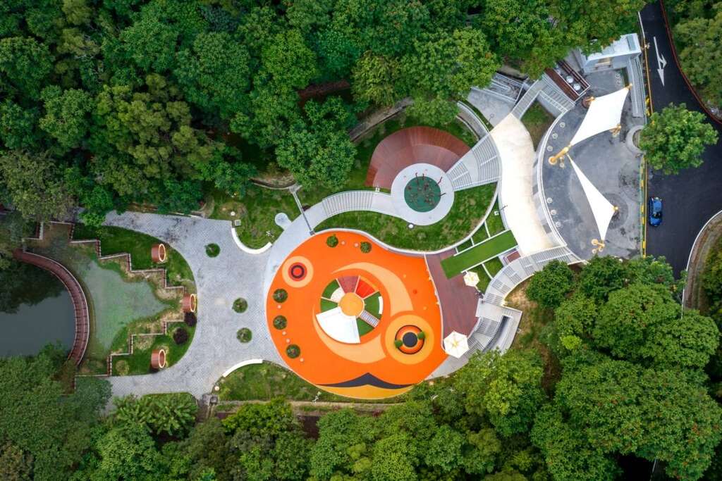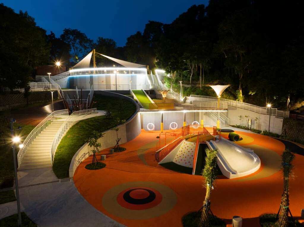 虎頭埤全齡式地景遊憩場由新綠主義股份有限公司設計,湧基營造工程有限公司施工,在臨水湖岸打造適合全齡的地景遊憩場域節點。將原基地現況老舊滑水道進行拆除,以減量設計增加自然空間,善用基地既有擋土牆等基礎設施進行整地配置,有效樽節工程開支節能減碳。設計上以高低空間建構全齡式地景,臨湖而下配置迎賓入口、大地織網木柱區、綠丘滑草道及遊戲場,景觀廣場與親水棧道能一覽湖光景色,打造友善安全親水環境;而林間親子環教生態步道,則由御達營造有限公司施工,以環狀系統串接連既有地貌、水綠系統及種植蜜源植物區營造環教解說場域。
