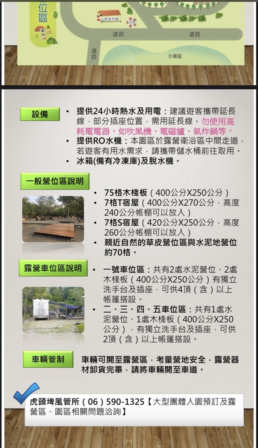 ●另有75格木棧板、7格T宿屋、7格S型宿屋、5組露營車位、及草地與水泥地營位尚可容納100頂以上,可直接現場選位。