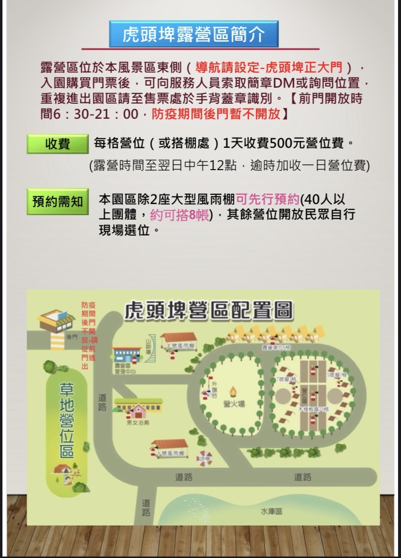 ●露營區位於本風景區東側,導航請設定"虎頭埤正大門"入園購買門票後,可向服務人員索取簡章DM或詢問位置。【前門開放時間6:30-18:00(露營遊客請於21:00前進出),防疫期間後門不開放】