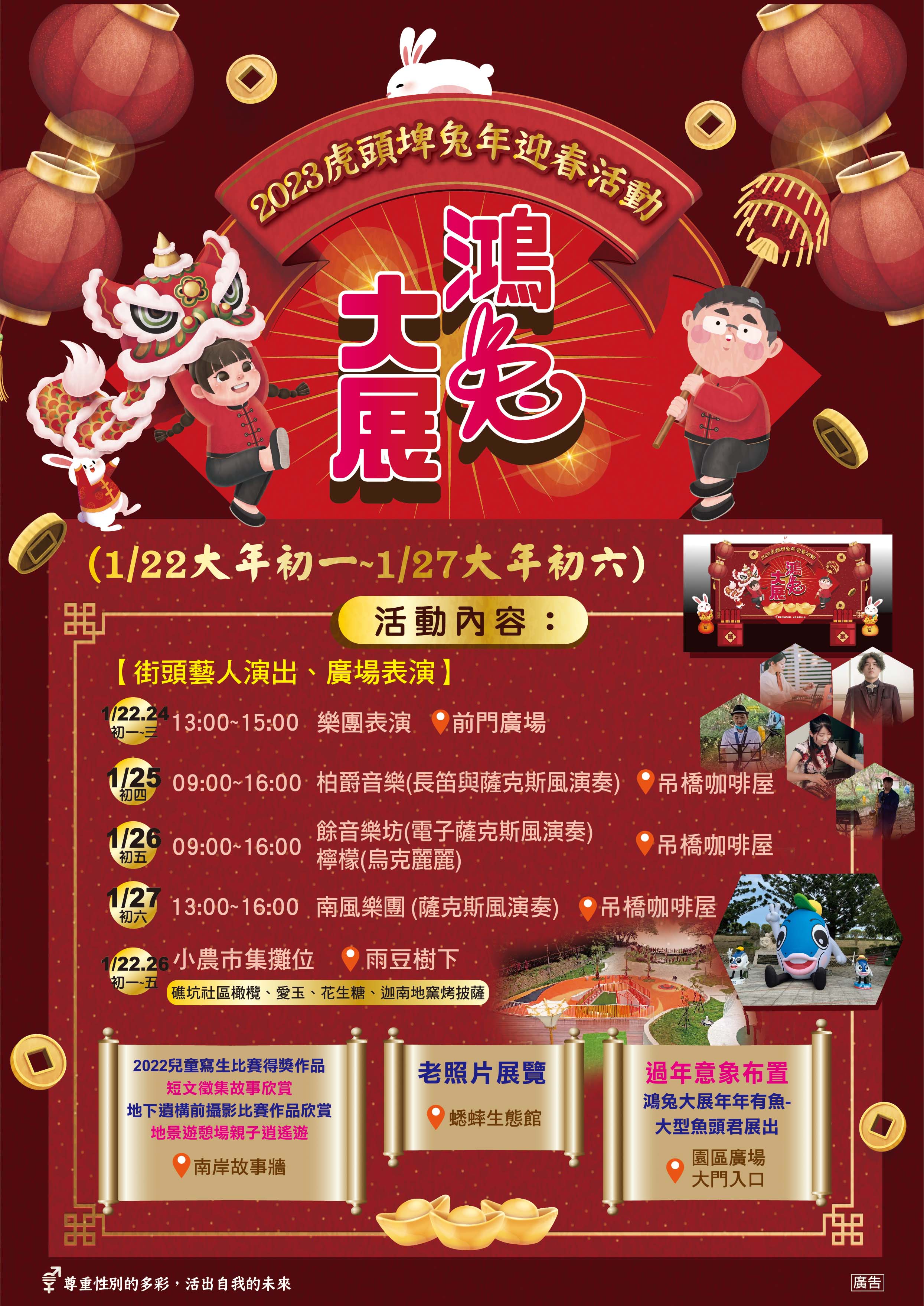 觀旅局郭貞慧局長表示,今(112)年元旦連假開始,台南旅遊迎來一波旅遊高峰,主要景點共有70萬人次遊台南,為迎接即將到來的春節,虎頭埤風景區將於大年初一至大年初六112年1月22日(一)~111年1月27日(六)舉辦「2023鴻兔大展虎頭埤迎春活動」,內容包括: