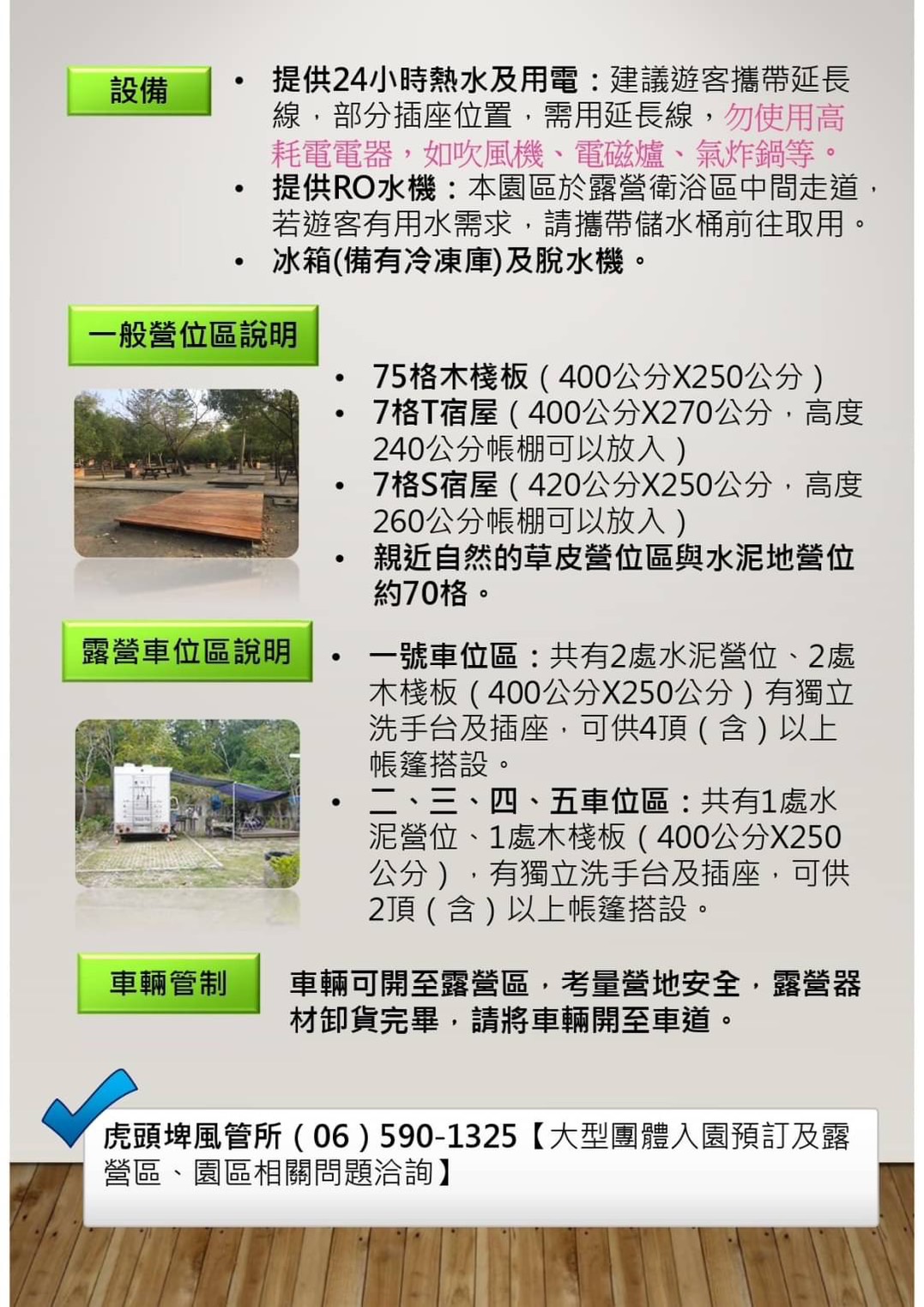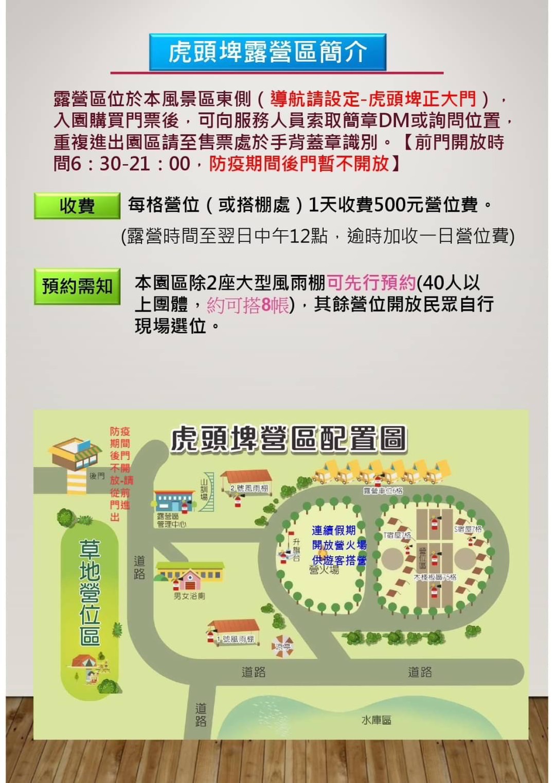 ●露營區位於本風景區東側,導航請設定"虎頭埤正大門"入園購買門票後,可向服務人員索取簡章DM或詢問位置。【前門開放時間6:30-18:00(露營遊客請於21:00前進出)
