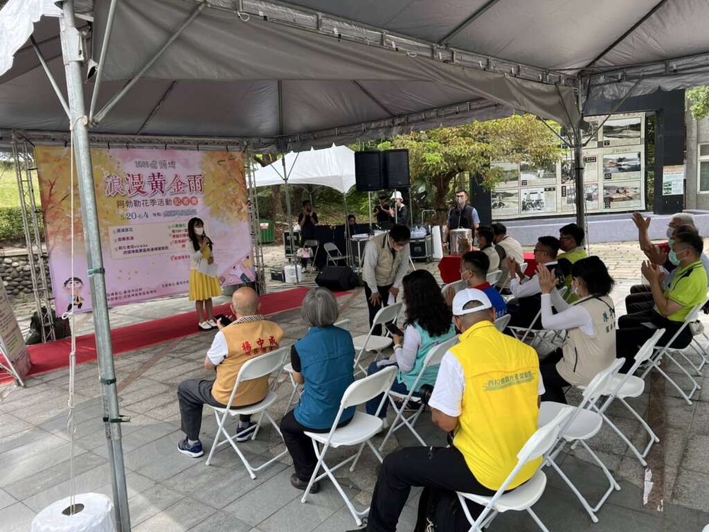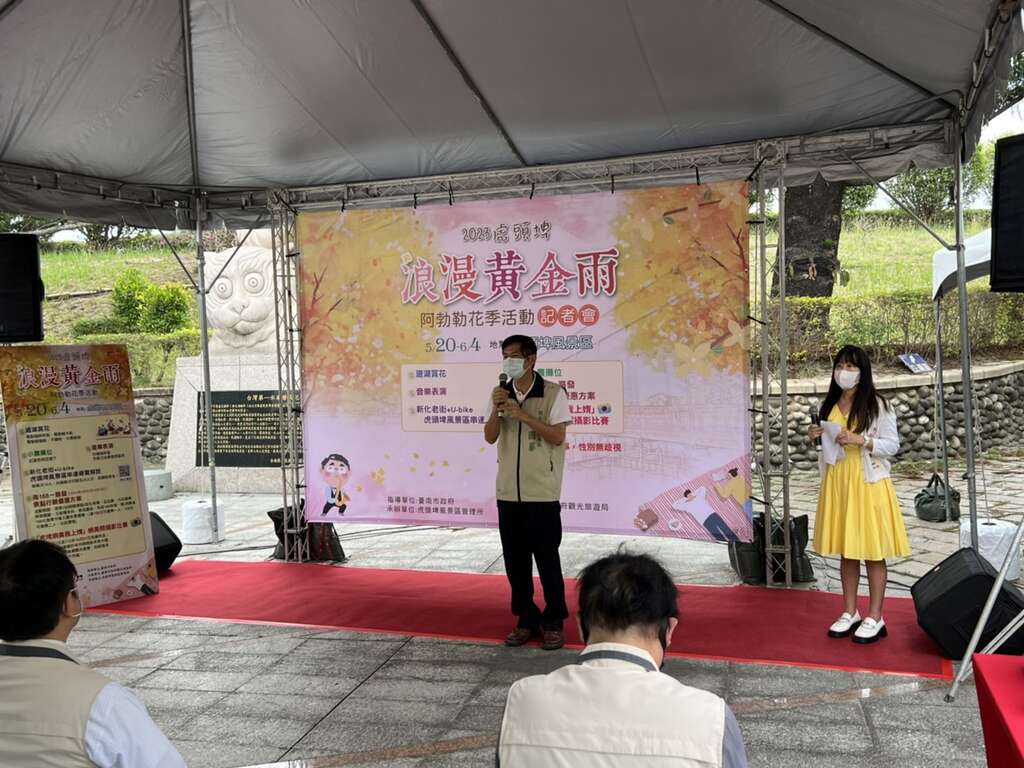 黃偉哲市長致詞時表示,每年的5、6月是阿勃勒盛放的季節,阿勃勒的英文俗名為Golden shower tree「黃金陣雨樹」,成串的金黃色花瓣隨風飄逸,微風吹動時,彷彿下一場黃金雨,虎頭埤在四十年前就在園區廣植阿勃勒樹,虎頭埤的阿勃勒是印度原生種,因此虎頭埤每年的這個季節就會舉辦阿勃勒花季系列活動,這個活動已舉辦了第15年,沿著虎頭埤環湖步道、竹林烤肉區、虎月吊橋、舊活動中心附近皆是賞花的重要景點,受到湖水的調節水氣充足,因此往年虎頭埤的阿勃勒都是相較於其他地區的阿勃勒稍晚盛開,本次也特別招集在地小農於花季期間設攤,讓民眾賞花同時也能品嚐與採買在地小農生產的在地農特產品,給予在地小農最直接的行動支持。