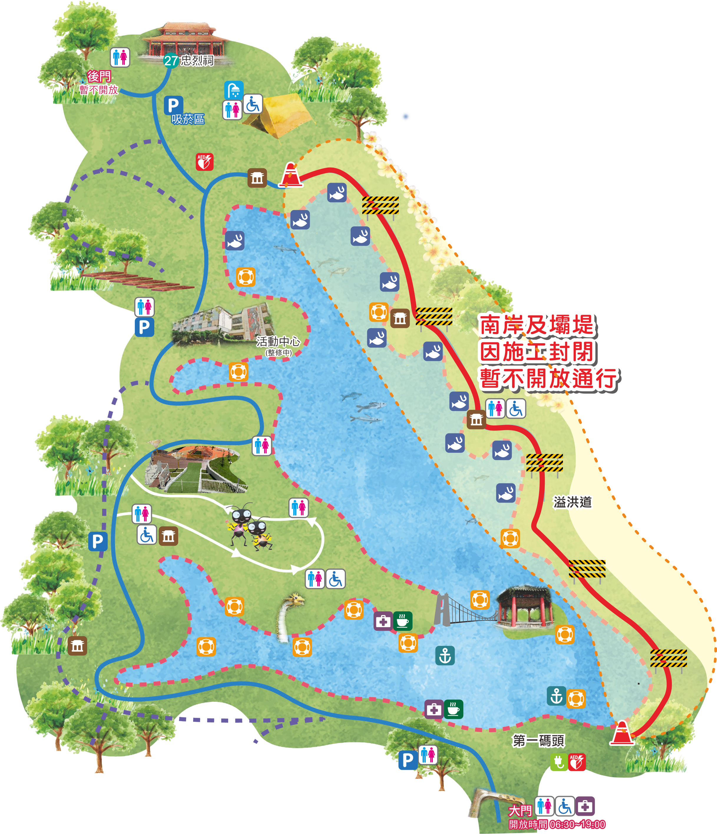 因應南岸三粒亭及南洋杉涼亭與壩堤施工,自113.3.11(周一)起,南岸進行管制人車通行,不便之處,敬請見諒。