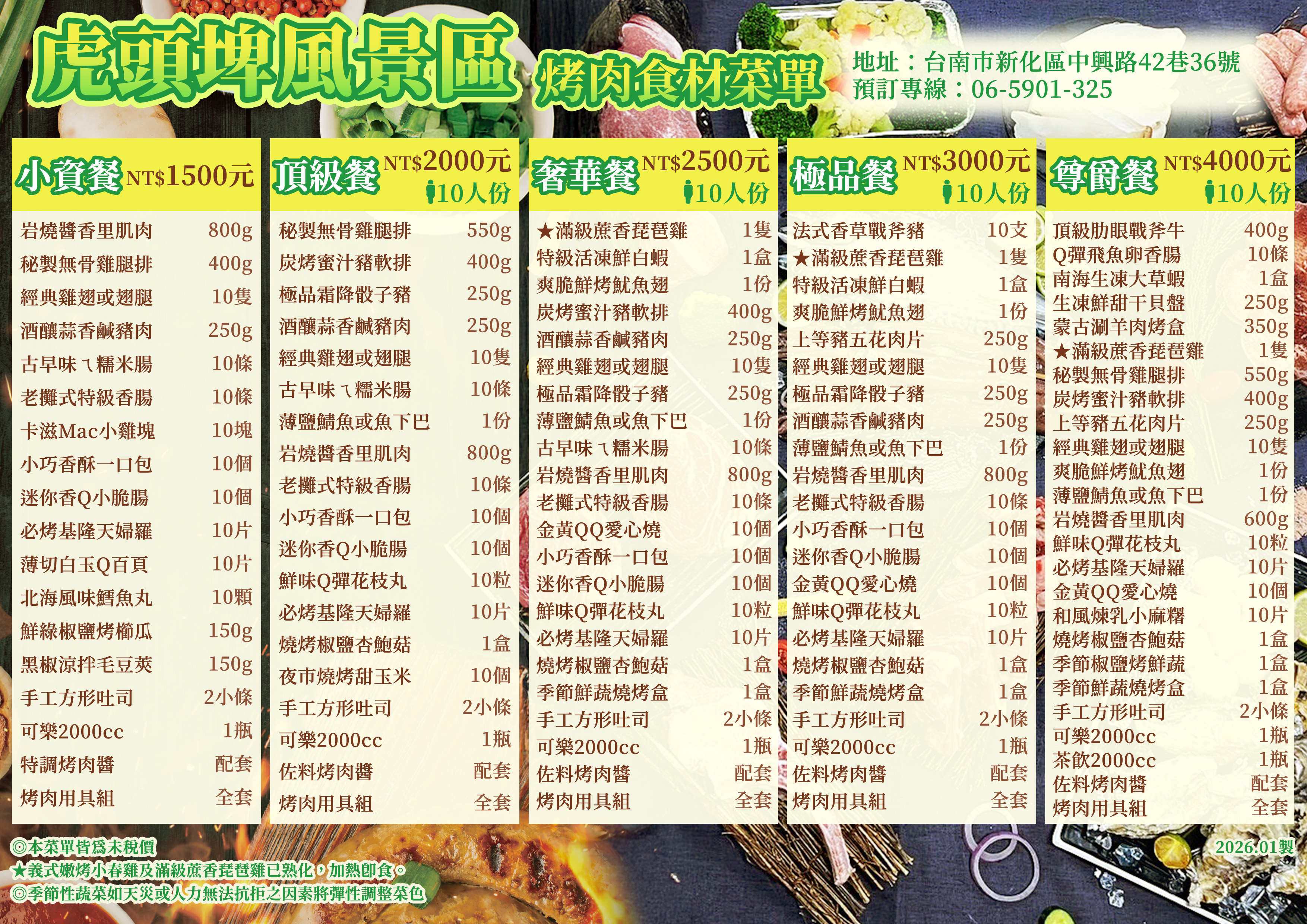 虎頭埤風景區烤肉食材菜單 歡迎來電訂購!