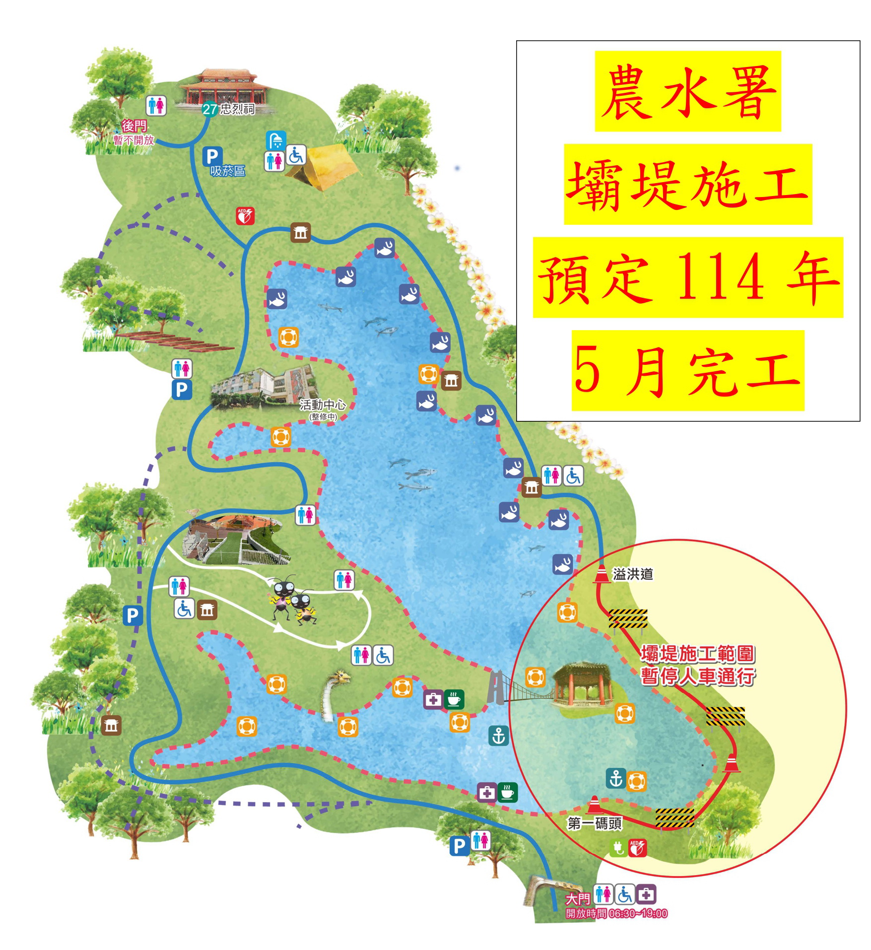 114年1月19日起探索區、南岸三粒亭及南洋杉涼亭與吊橋內虎月亭皆開放參觀,車輛已可通行至南洋杉涼亭,釣魚區亦恢復開放,另壩堤工程,農水署預計114年5月始可完工開放。