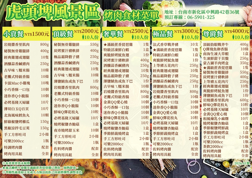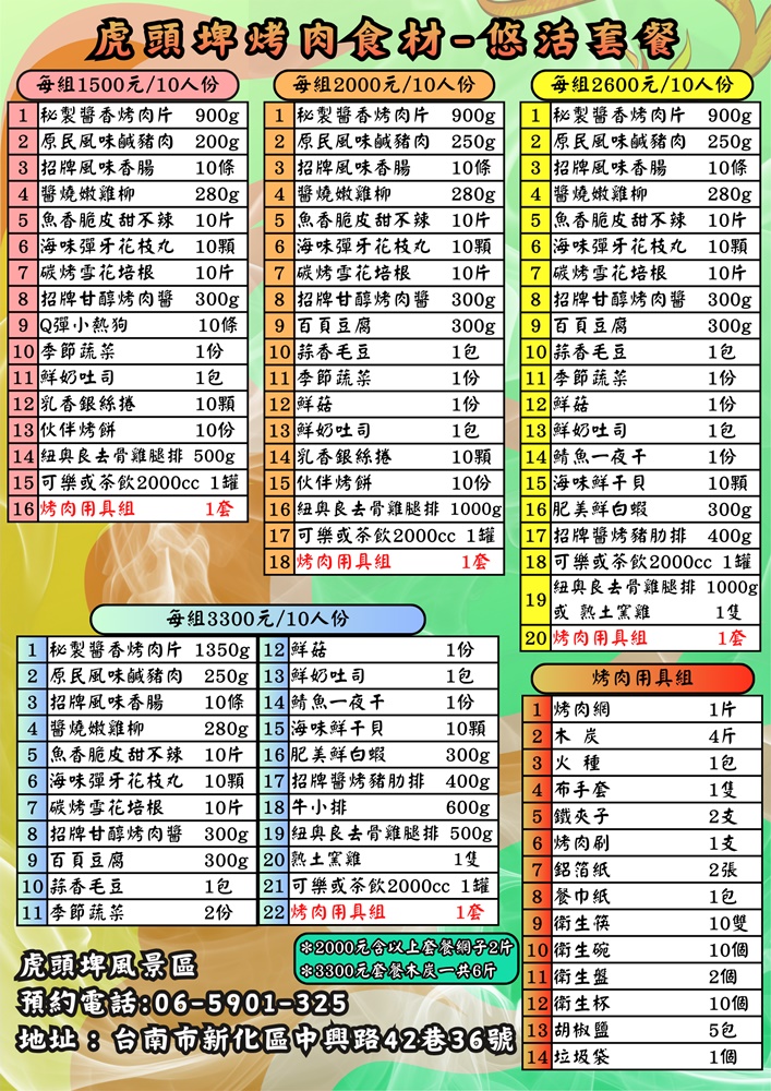 觀光旅遊局林國華局長表示,為慶祝虎頭埤風景區竹林烤肉區重新開放,園區推出多樣烤肉食材優惠活動,即日起至3月底,凡訂購「歡樂套餐」即贈送生蠔500g/盒及棉花糖10顆/份,訂購「悠活套餐」贈送雞腿排(詳細食材內容請至虎頭埤風景區網站查詢),同時為滿足更多遊客烤肉露營需求,於探索露營區內設置有烤肉爐架及臨時衛浴設備等,提供完善的服務設施。另園區內提供遊客可付費使用的電動遊園車、太陽能遊湖船及腳踏船等多項設施,亦有可免費參觀之「親子環教生態館」體驗寓教於樂之生態學習場域,歡迎全國遊客來到虎頭埤風景區享受豐富愜意的旅程!